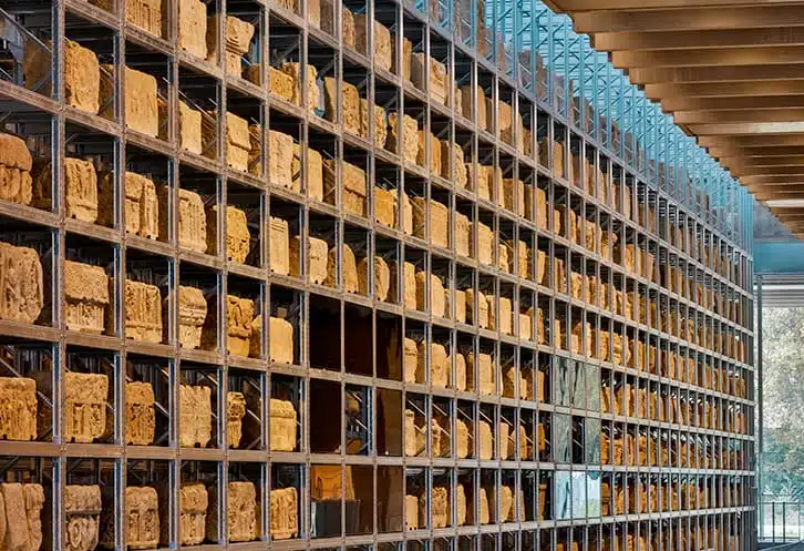 A true backbone of the Museum building, a monumental wall composed of 760 stone blocks, mostly from the funerary sites of the ancient city, restores the memory and monumentality of the Roman city and constitutes an open and modular reserve, thanks to an automated device never before seen in a museum.